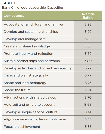 Advocating for children and families was highly rated; yet additional data collected in the study showed that this value was not reflected in participants’ practice. Respondents ranked leadership capabilities related to personal characteristics and relationship building (e.g., self-regulation; developing and sustaining relationships; and sustaining partnerships) as very important. Collectively, items related to instructional leadership (e.g., developing individual and collective capacity; shaping and leading pedagogy; promoting inquiry and reflection; and creating and sharing knowledge) were ranked lower than advocacy or relationship building. Capacities related to administrative leadership (e.g., aligning resources with outcomes; developing a unique service culture; thinking and planning strategically) ranked lowest in the list.